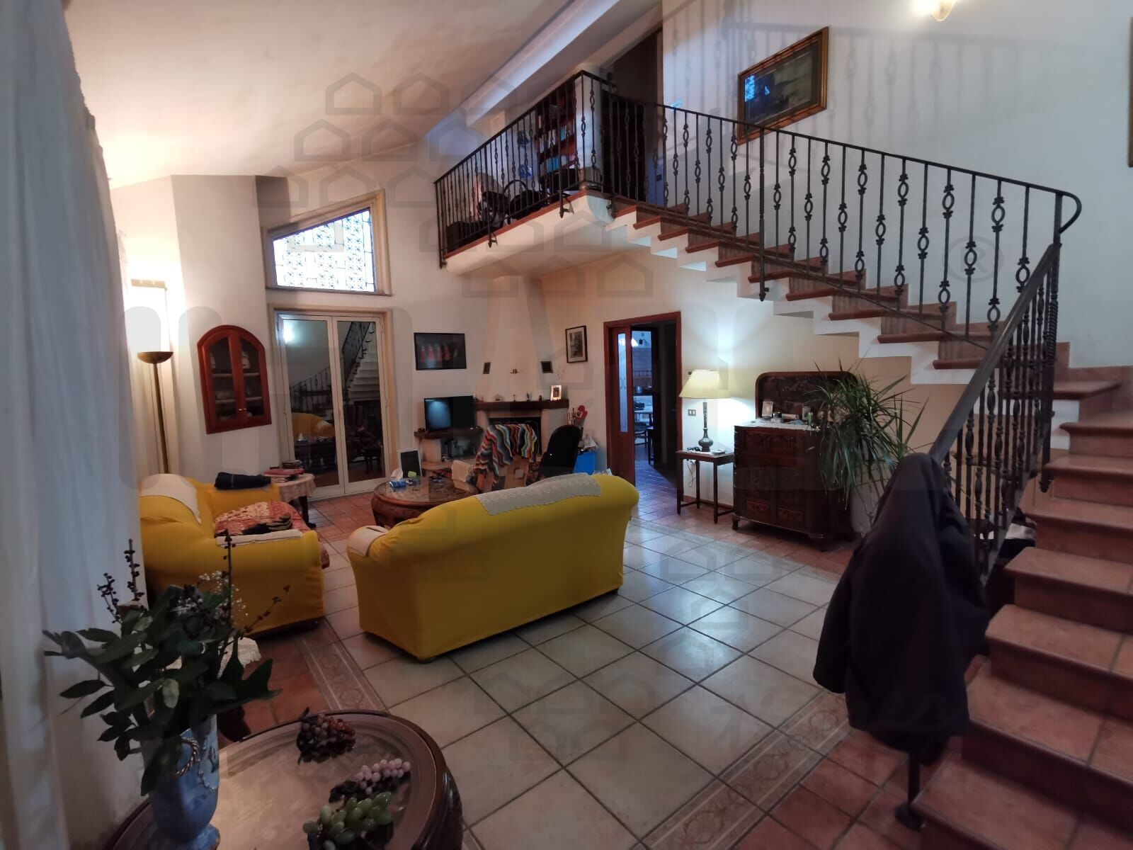 ingresso su salone doppio con camino, cucina abitabile con dispensa finestrata, camera da letto, servizio, grande terrazzo,giardino coltivato.