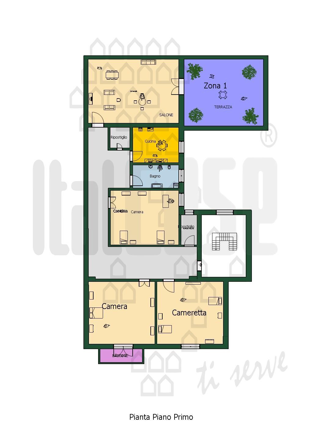 APPARTAMENTO AL PRIMO PIANO DI MQ 120 C.A COMPOSTO DA: INGRESSO, SALONE, CUCINA SEMI-ABITABILE, CAMERA DA LETTO, 2 CAMERE, WC, 2 RIPOSTIGLI - TERRAZZINO DI C.A. 25 MQ